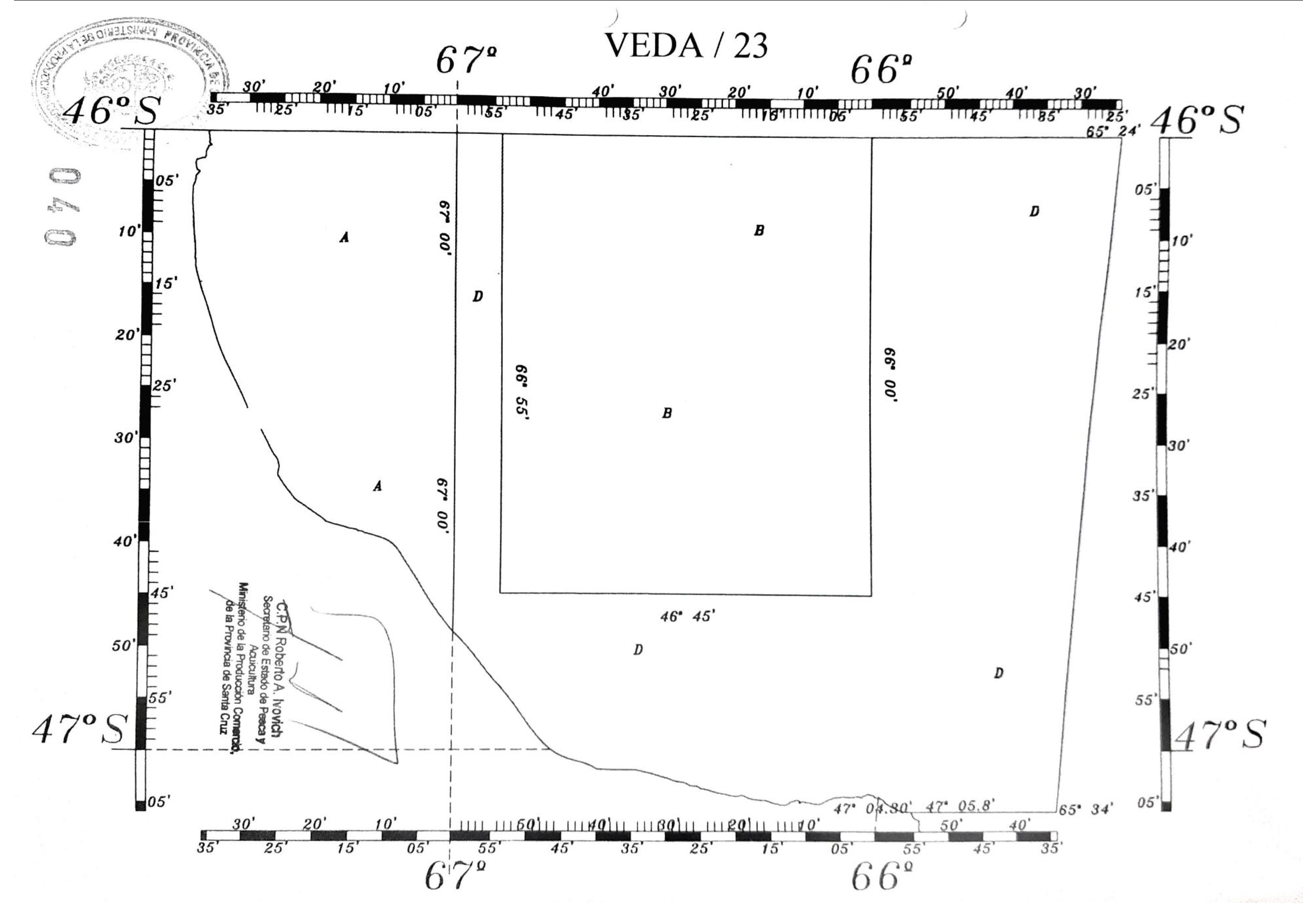Latitud 47º 05,80' S Longitud 65º 34,00' W (límite de jurisdicción provincial) y los puntos que delimitan las 12 millas de jurisdicción provincial al sur de la latitud 47º S (Ley Nacional Nº 23.968).-