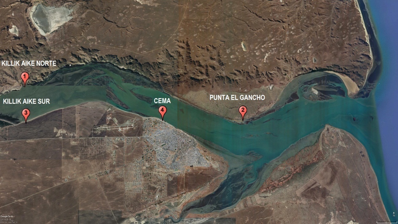 A. Sobre margen norte desde el punto 51°34’25.95’’S - 69°26’25.5’’O (Killik Aike Norte) hasta 51°35’59’’S - 69°05’51”O (Punta El Gancho).-